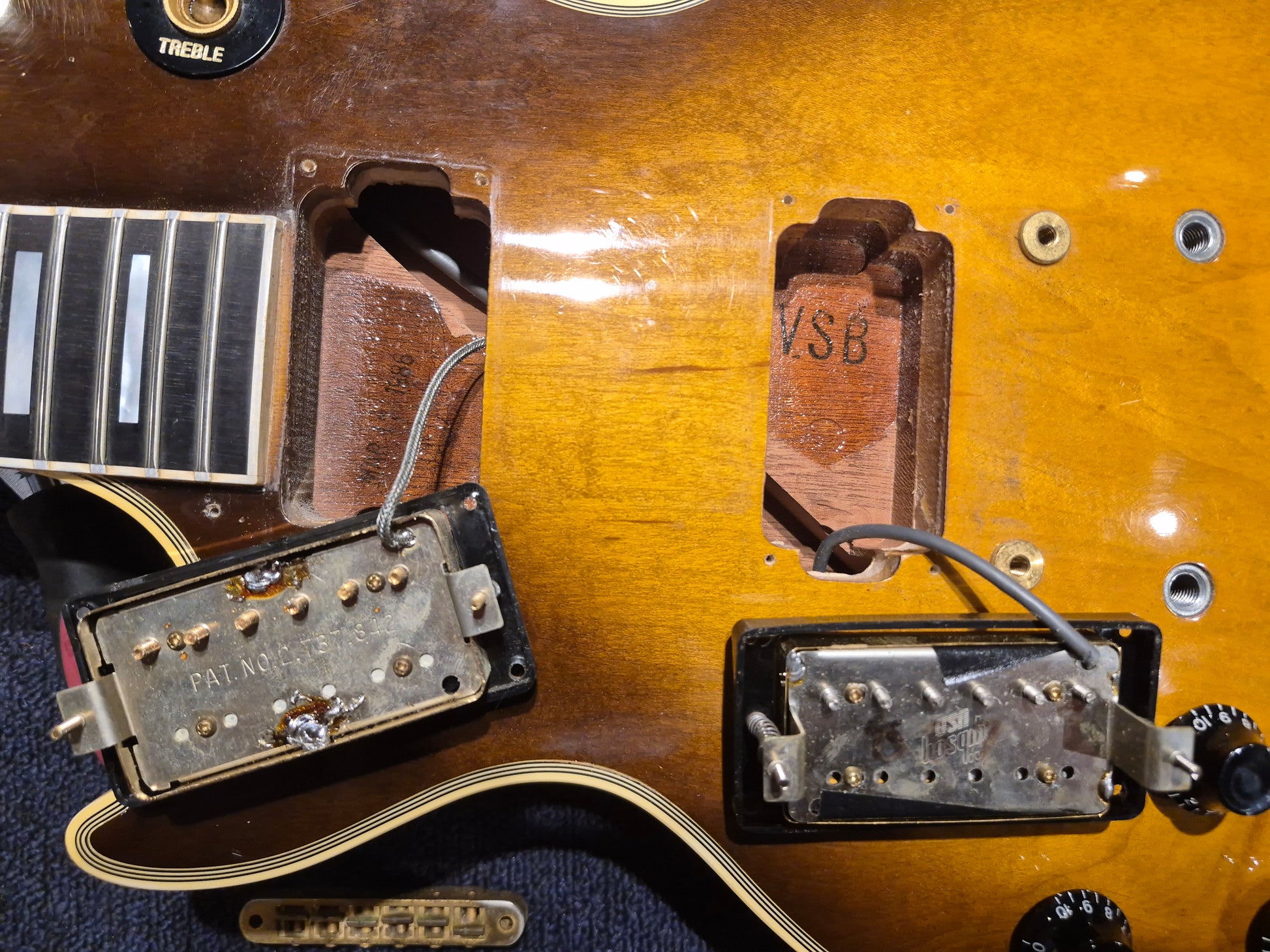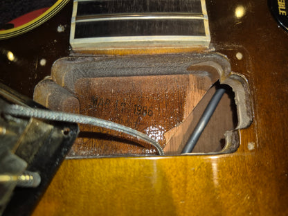 | Electronics: | The bridge pickup has been replaced with a Gibson USA Original Humbucker. The rest of the electronics are original. The guitar has two humbuckers, a three-way selector switch, two volume pots, and two tone pots. The original bridge pickup is included in the case. The pot codes date to 1985. |