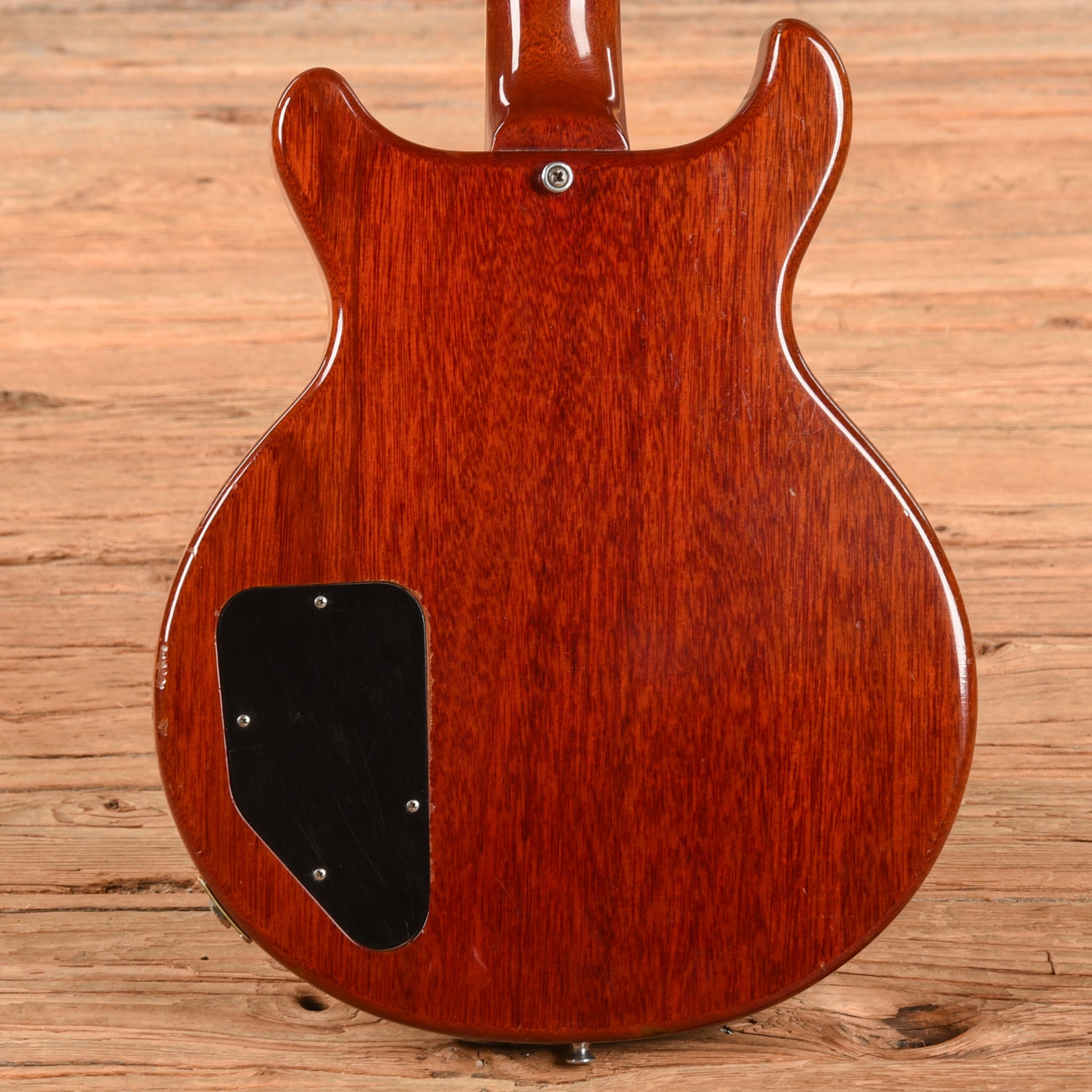 Modifications/Repairs: At some point different tuners were installed, so the holes have been reamed out larger and there are extra screw holes visible on the back of the headstock. The original tuners were reinstalled with non-original conversion bushings to fill the enlarged holes. A compensated bridge and locking studs have been installed. The guitar has been refretted. The neck heel has been repaired. The base of the neck pickup cavity has been filled with epoxy to reinforce the neck heel repair. The finish on the back of the neck heel has been touched up.
