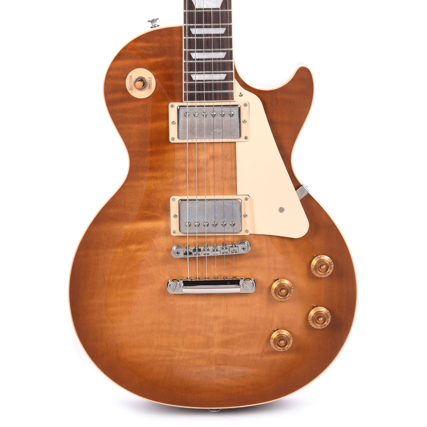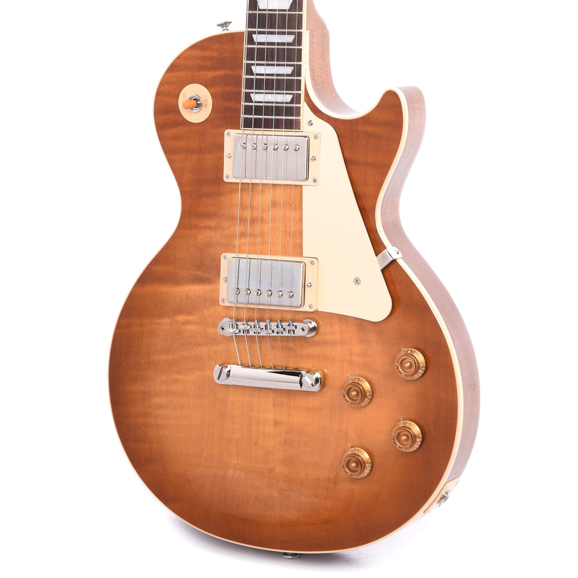 The CME Exclusive Gibson Les Paul Standard ’50s models feature a distinguished Dirty Lemon Burst inspired by the beautifully fading original cherry bursts from the late ’50s. Standard ’50s models boast a Vintage ’50s neck profile, rosewood fretboard, and gold “top hat” control knobs with pointers, plus Vintage Deluxe tuning machines with keystone buttons.