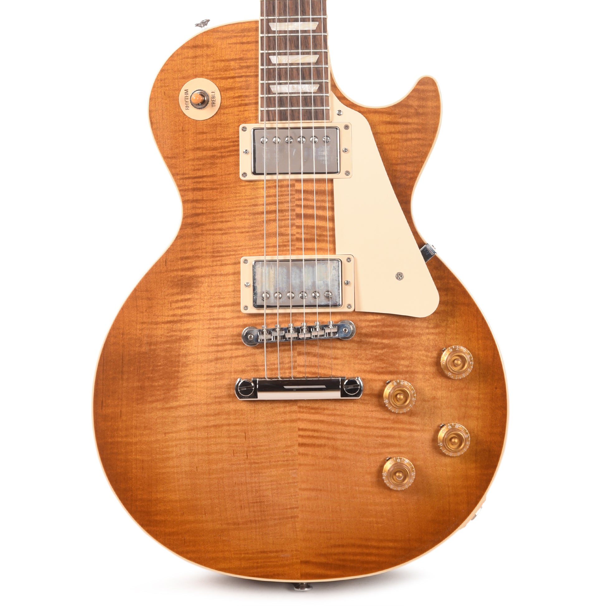 The CME Exclusive Gibson Les Paul Standard ’50s models feature a distinguished Dirty Lemon Burst inspired by the beautifully fading original cherry bursts from the late ’50s. Standard ’50s models boast a Vintage ’50s neck profile, rosewood fretboard, and gold “top hat” control knobs with pointers, plus Vintage Deluxe tuning machines with keystone buttons.