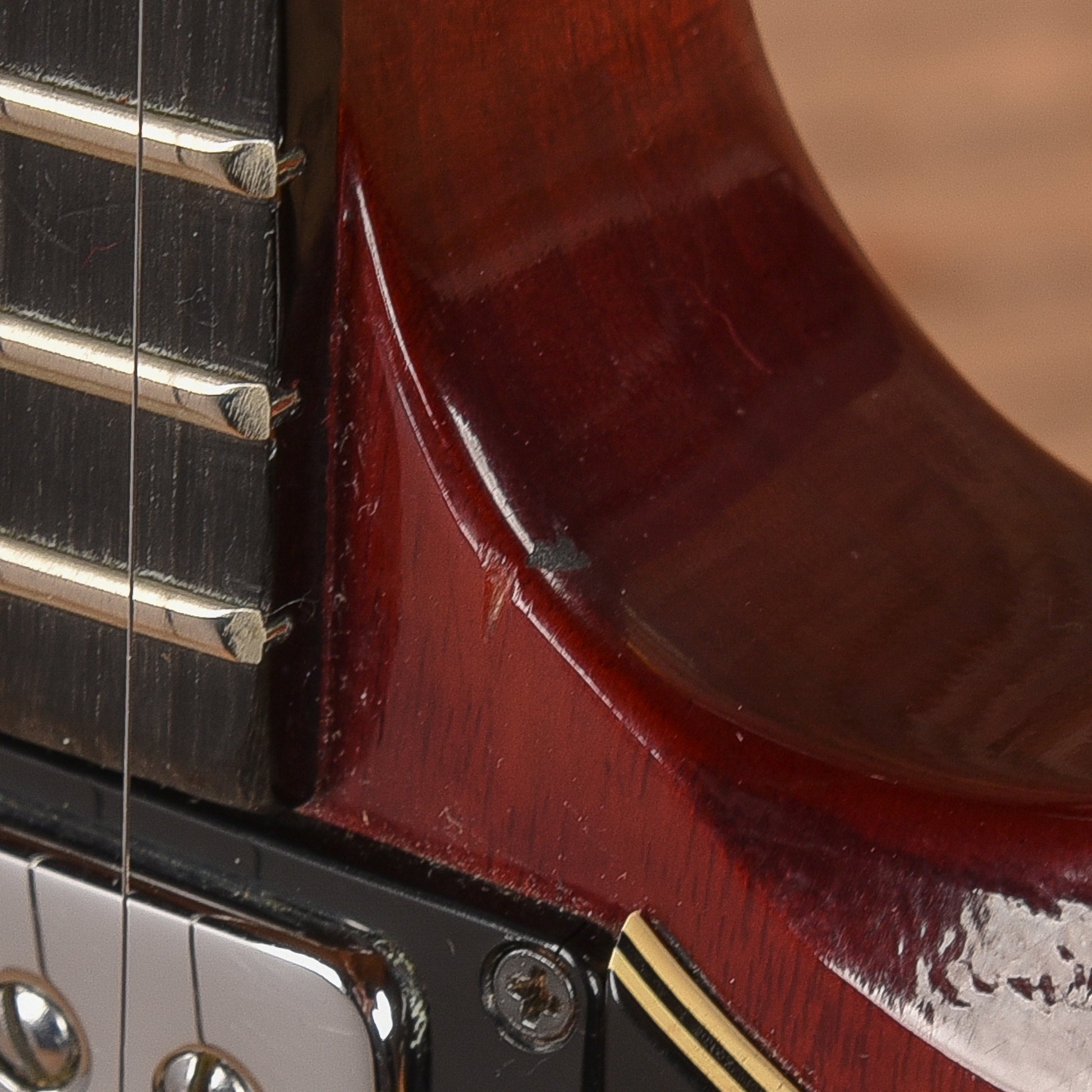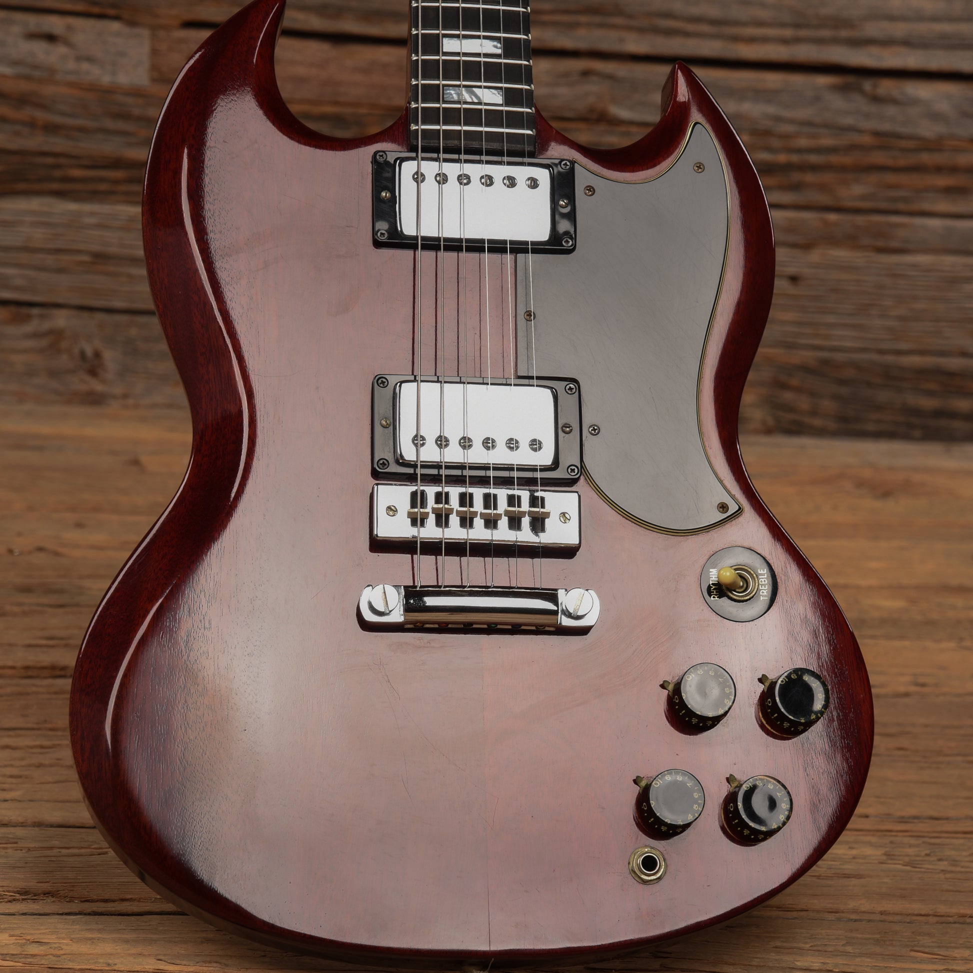 | Tech Notes: | This SG plays well with low action and optimal neck relief. The frets are tall and show moderate wear. The guitar is being dated to 1974 based of the serial number and pot codes. |