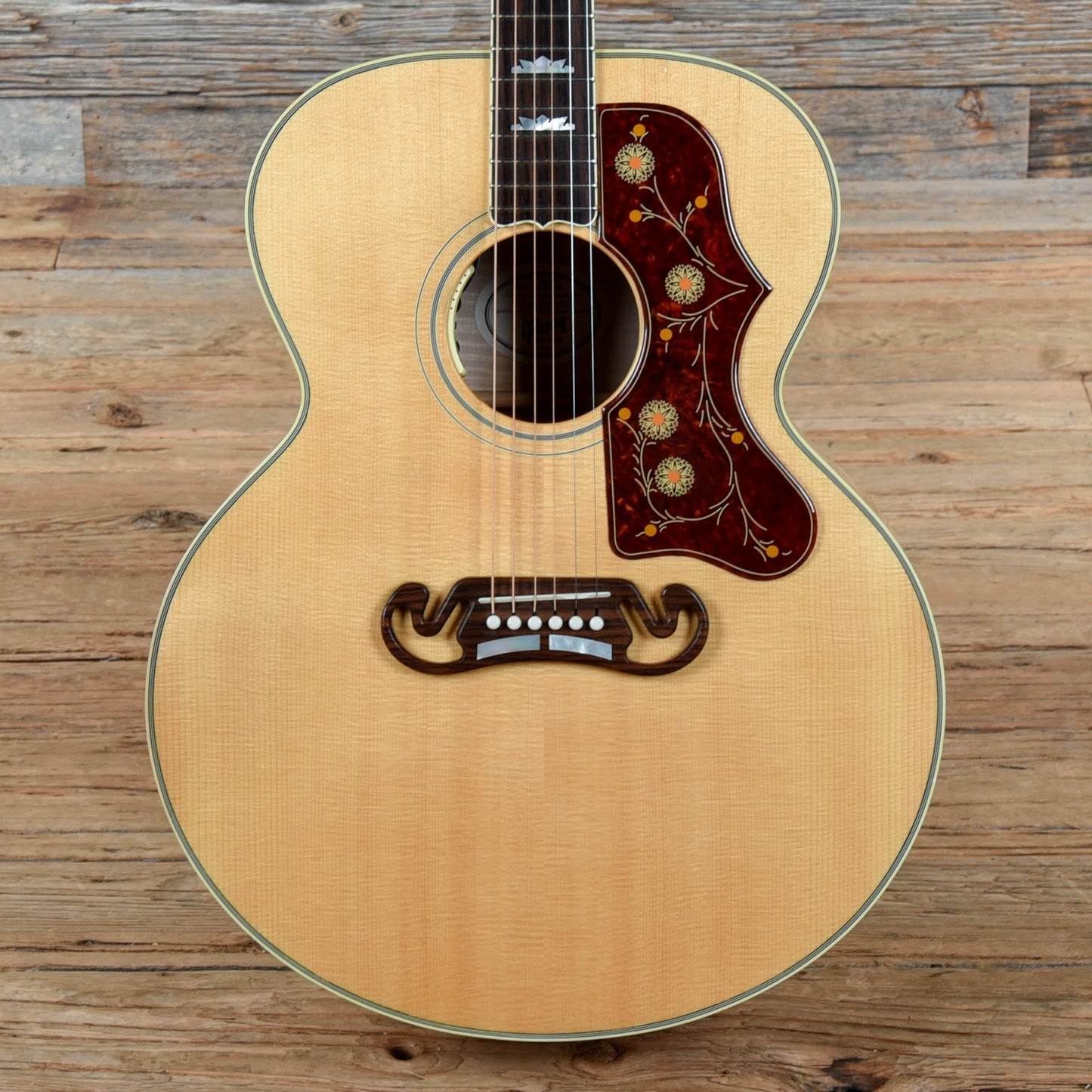 | Tech Notes: | This SJ-200 plays well with low action. The frets are tall and show light wear. |