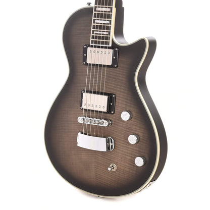 The Ultra Max shares the same small body concept of the Ultra Swede, yet with a slightly larger proportioned mahogany body topped with a thick custom carved flame maple top. The body joins to a mahogany set neck utilizing a mortise and tenon neck joint with a 25.50” scale length, which naturally features our H-Expander™ truss-rod and Resinator™ fingerboard. Its sleek and “ultra-comfortable fast neck” is paralleled with our Custom 60 Alnico-5 pickups with their eloquent Aluminum Brushed covers, delivering the cutting voice that this instrument demands.