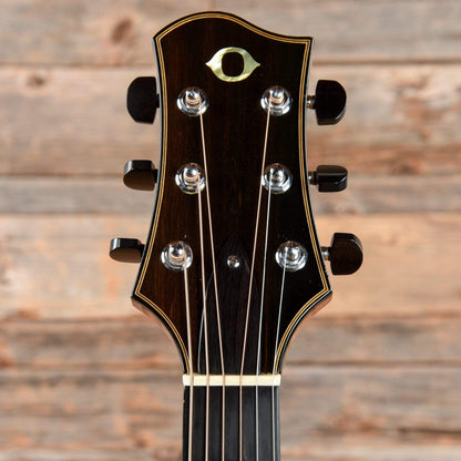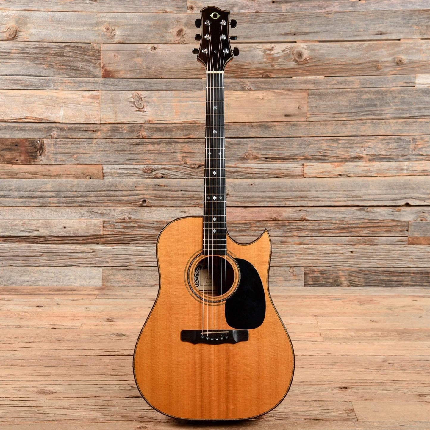 | Tech Notes: | Plays well with low action and optimal neck relief; the guitar is currently set up with 12-52 light acoustic strings. The frets show light wear under the plain strings in the first position. The label inside the body is dated 1985. |