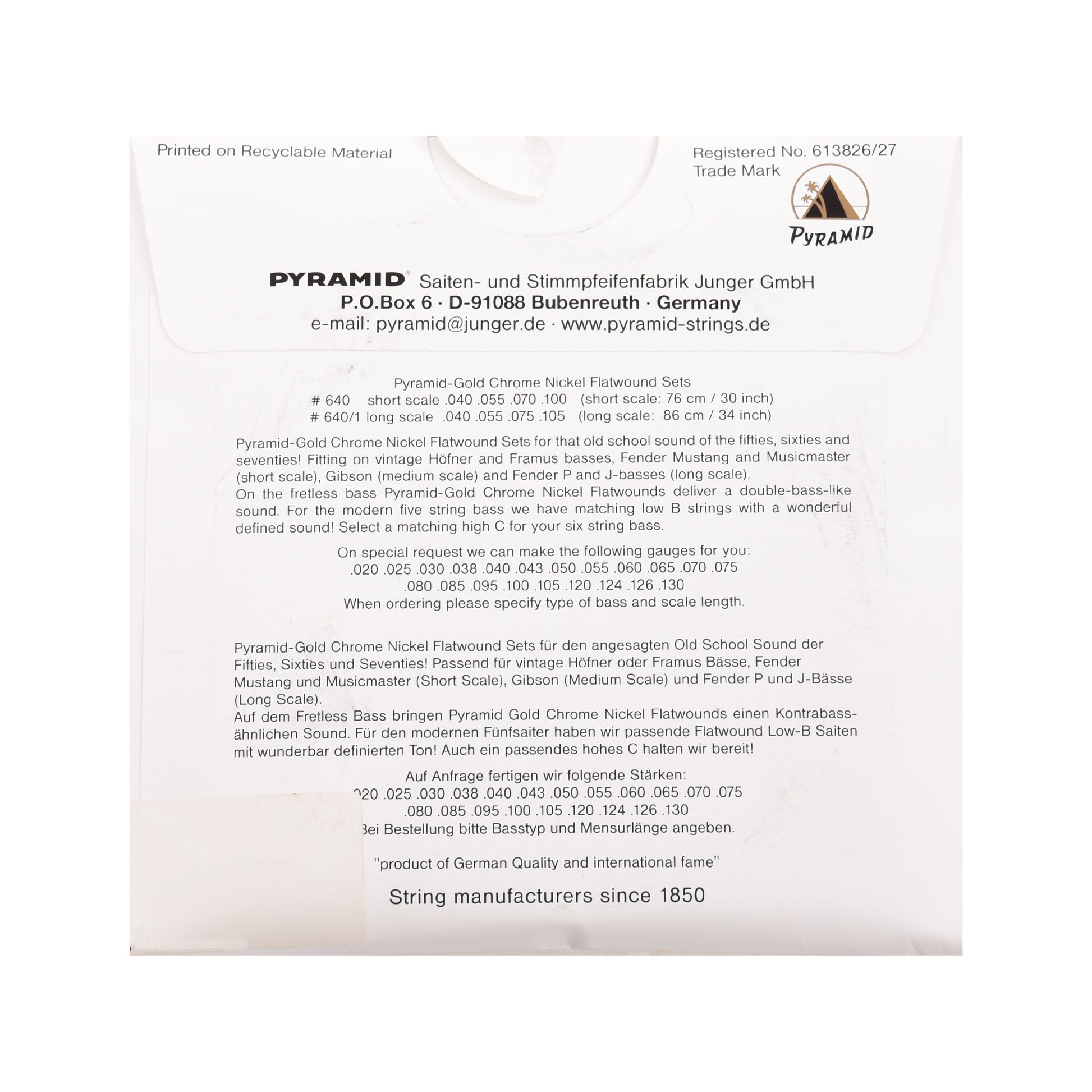 GOLD SERIES FLAT WOUND - Strings are short scale (30"/76cm), appromimately 040w 055w 070w 100w. Made in Germany. STRING GAUGES MAY VARY AS THEY ARE HAND WOUND.