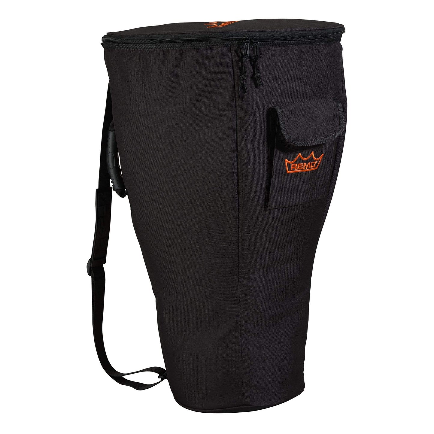 The Remo Djembe bag is constructed with an outer layer polyester woven fabric, and a middle layer 1/4" foam base with a durable nylon inner lining. This bag also features a 1" heavy-duty woven polyester padded strap, a side pouch with Velcro flap, and a padded carrying handle.