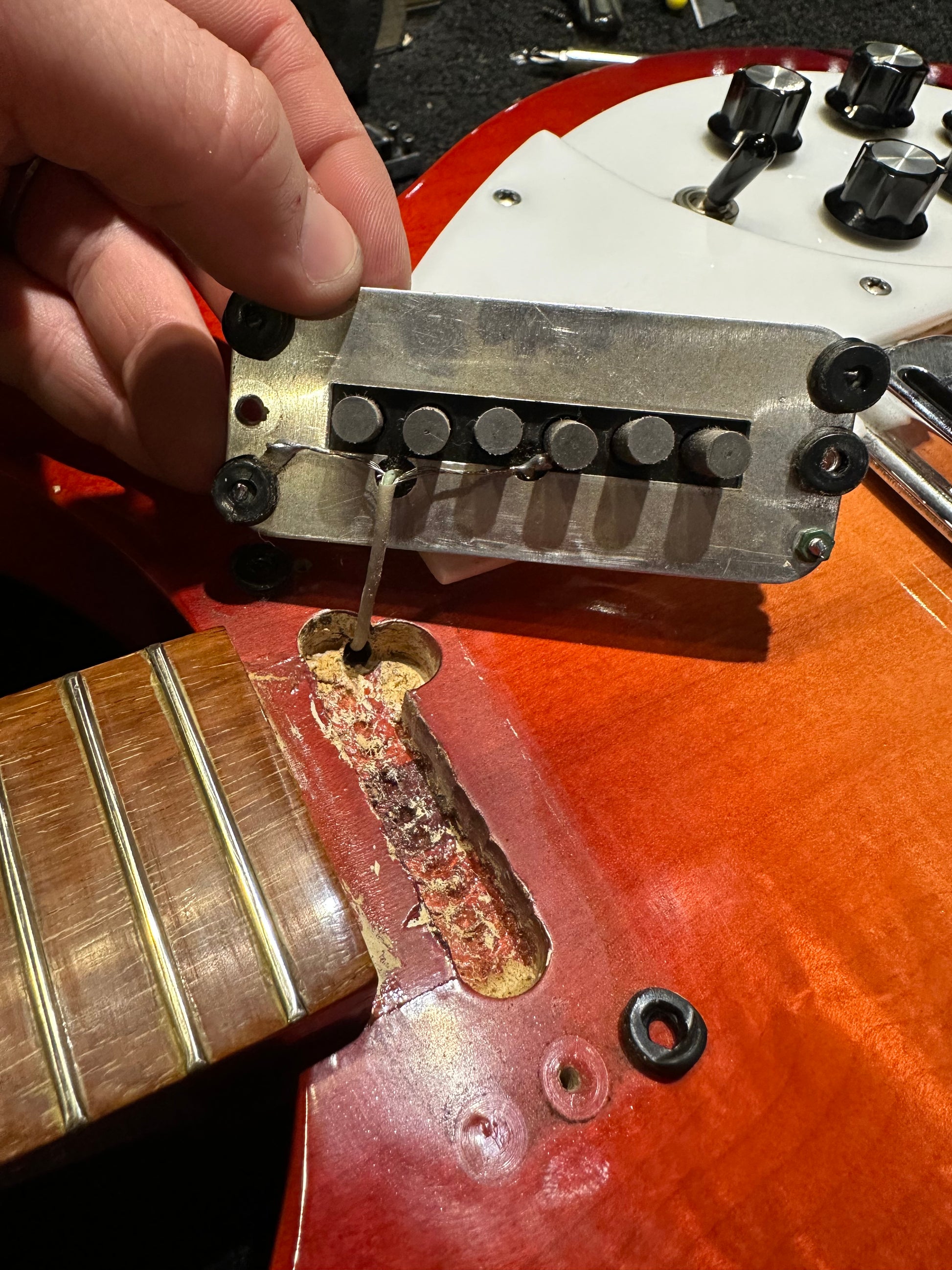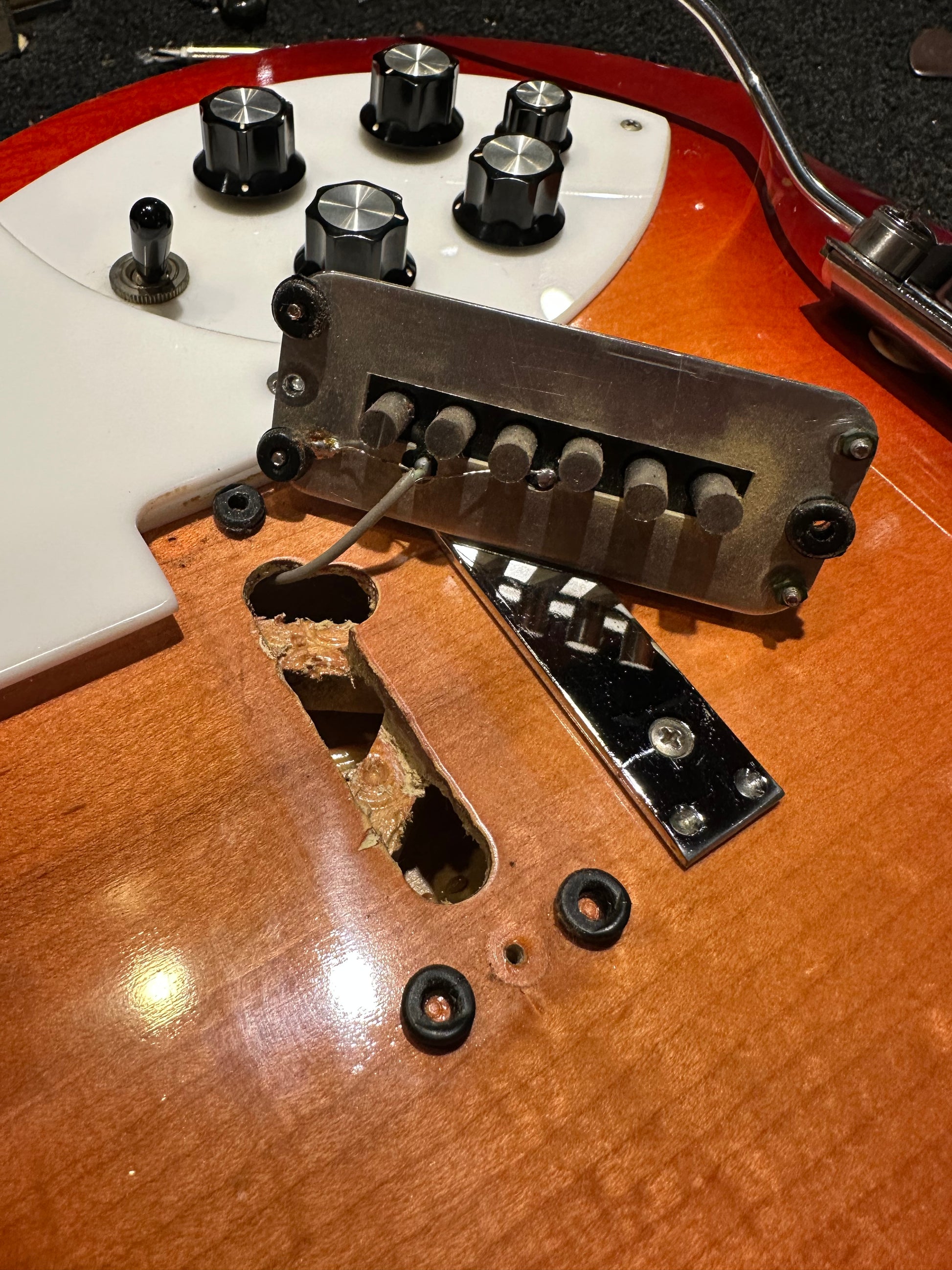 | Electronics: | Original Rickenbacker pickups with a three-position switch, two volume pots, two tone pots, a secondary neck volume pot, and a single output jack. All electronics are original with the pots displaying 1965 dates. |