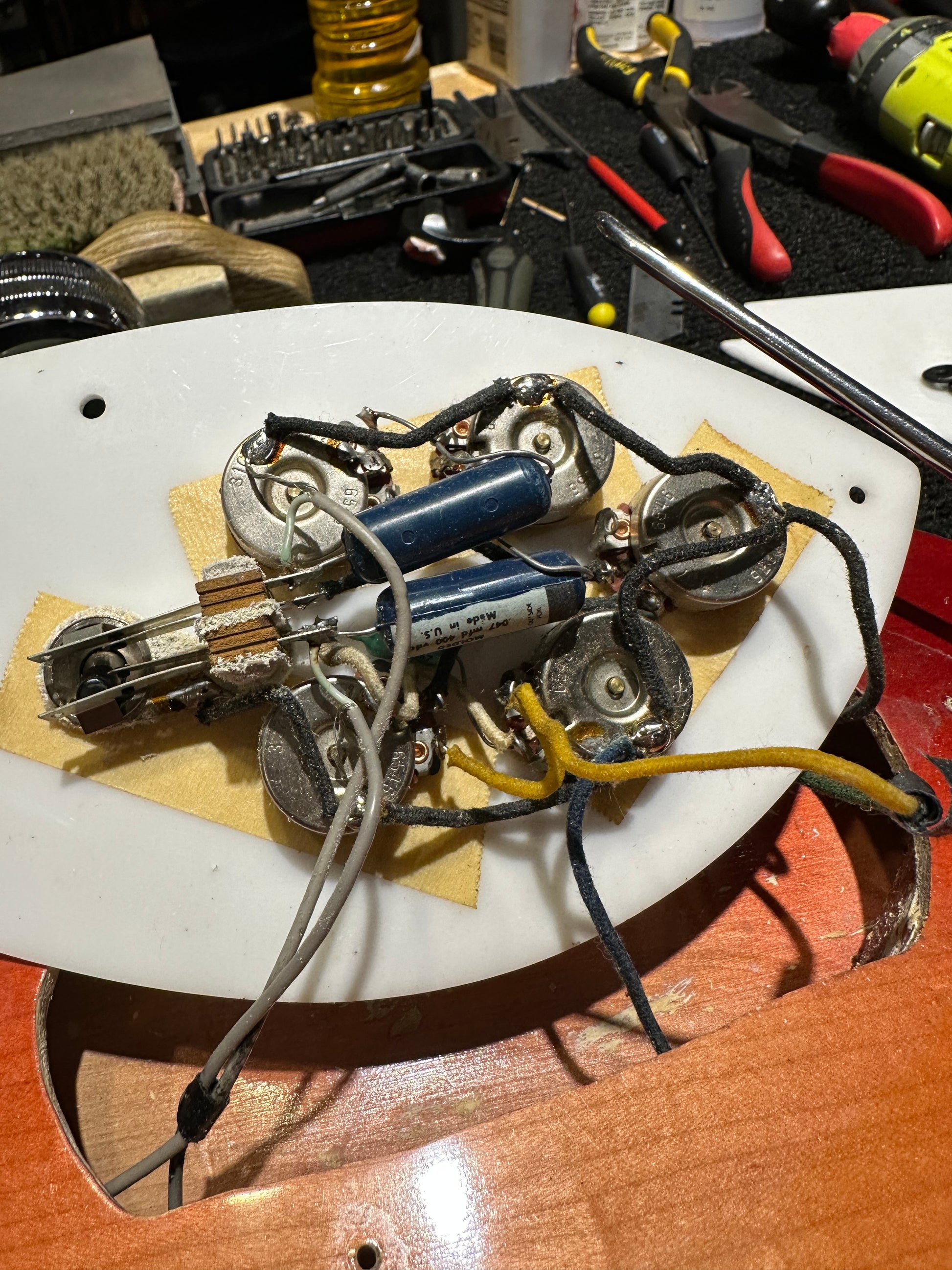 | Tech Notes: | This 335 plays well with low action and optimal neck relief. The original frets are thin and show moderate wear. The guitar is being dated to early 1866 based on the serial number and pot codes. |