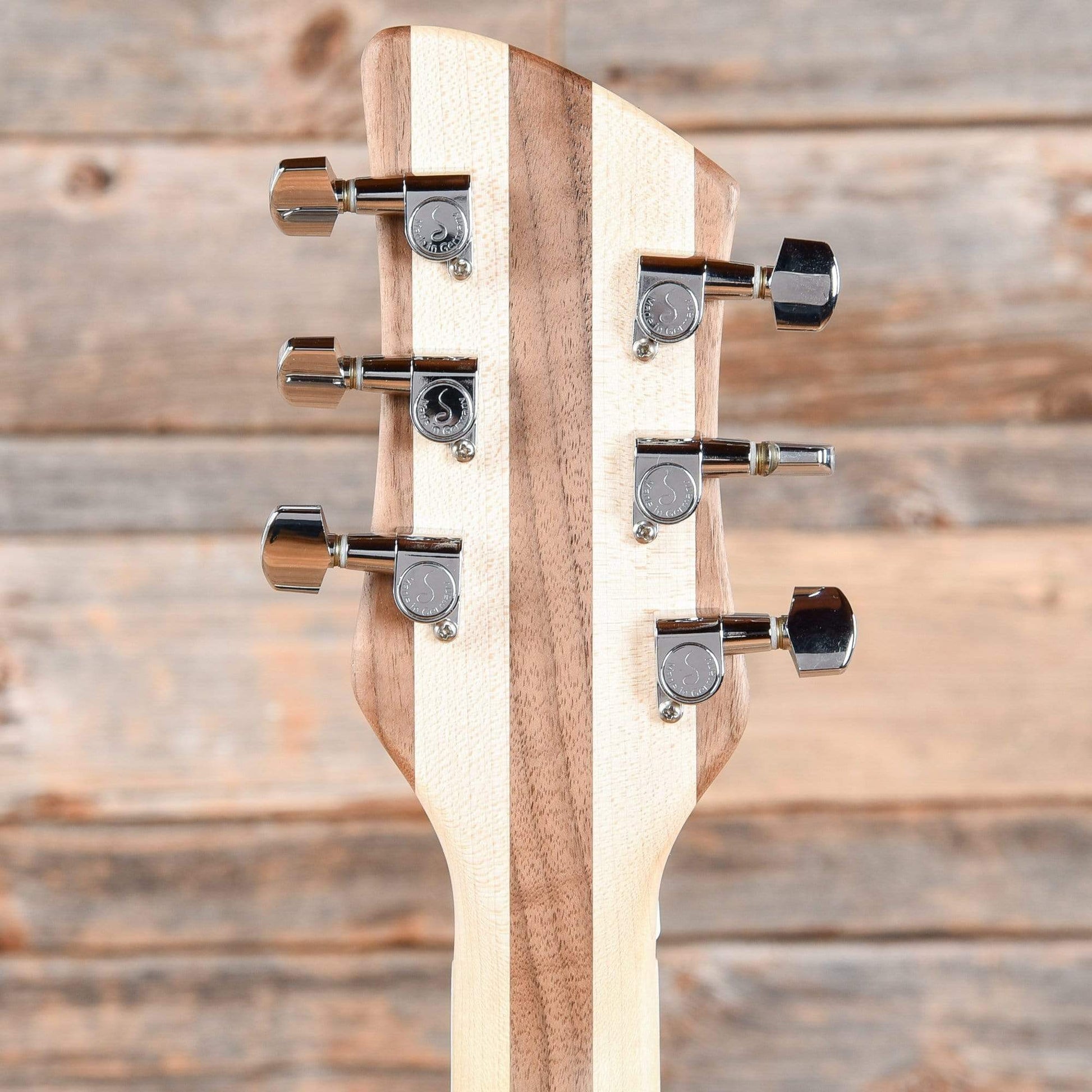 | Neck Details: | Laminated three-piece maple & walnut set neck with a bound maple board, pearloid right-triangle inlays, dual truss rods adjustable at the headstock |