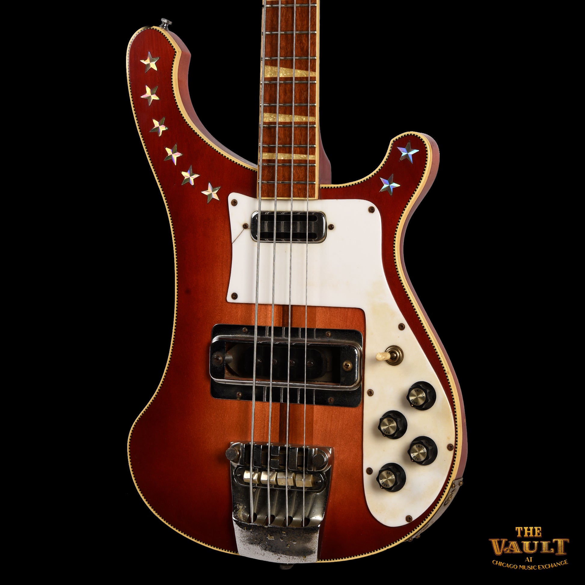 | Cosmetic Condition: | This vintage 4001 is in good cosmetic condition with moderate wear throughout. There is checking, dings, dents, and scratches. Star stickers have been added to the face of the headstock and body. |