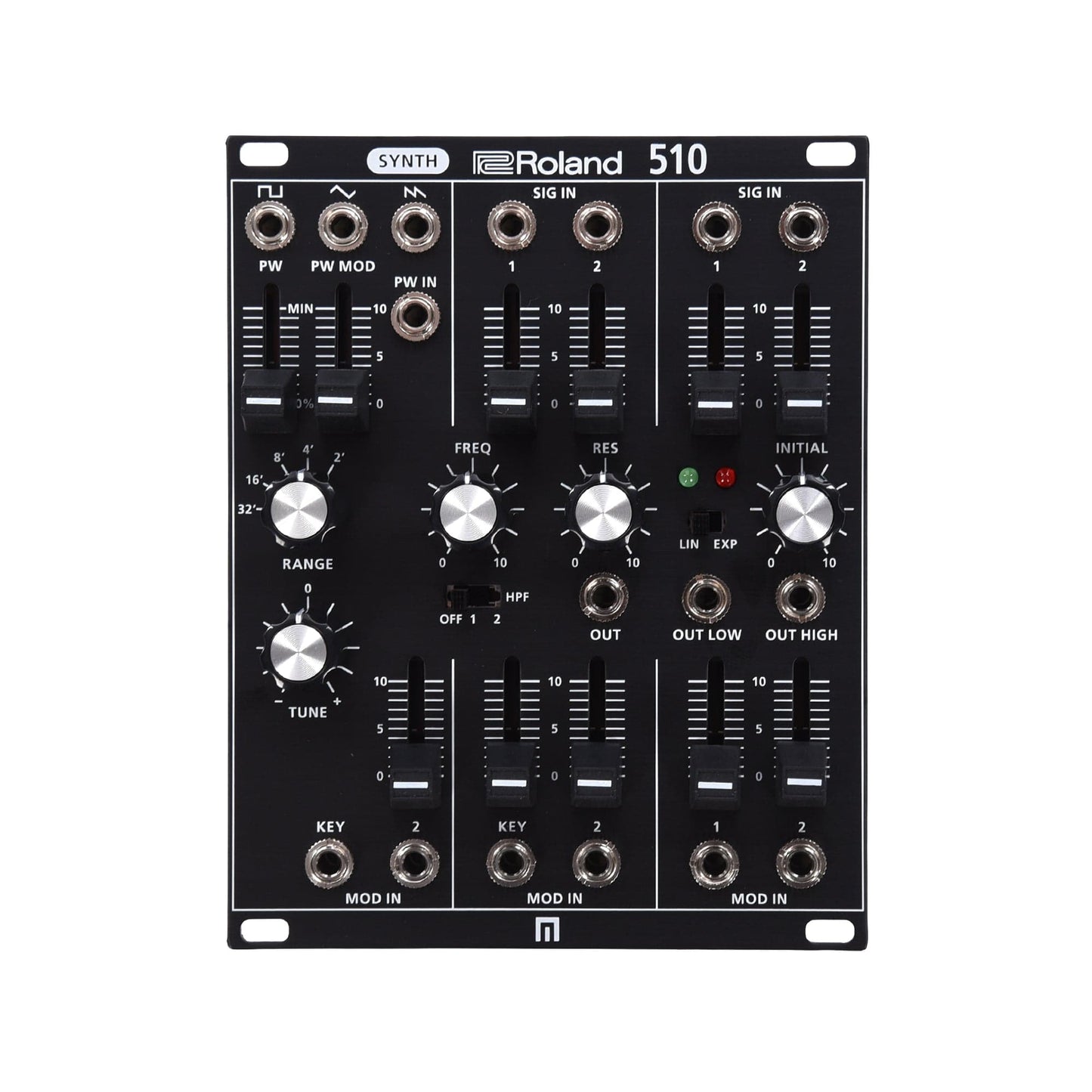With the SYS-510, designing your first modular setup or integrating classic Roland sound into your existing modular rig has never been easier. Based on the vintage SYSTEM-100m's 110 VCO, VCF, and VCA module, the SYS-510 brings together the best aspects of the SYSTEM-500 into a single voice module. It contains three pristine oscillator waveforms, classic Roland low pass filter with hi-pass switches, and a VCA with multiple outputs. It has inputs for external signals and modulation, and output jacks for both Eurorack and line-level audio. At 20hp and internally normalled for cableless operation, the SYS-510 is an essential building block, whether you’re an experienced user or just diving into modular synthesis.
