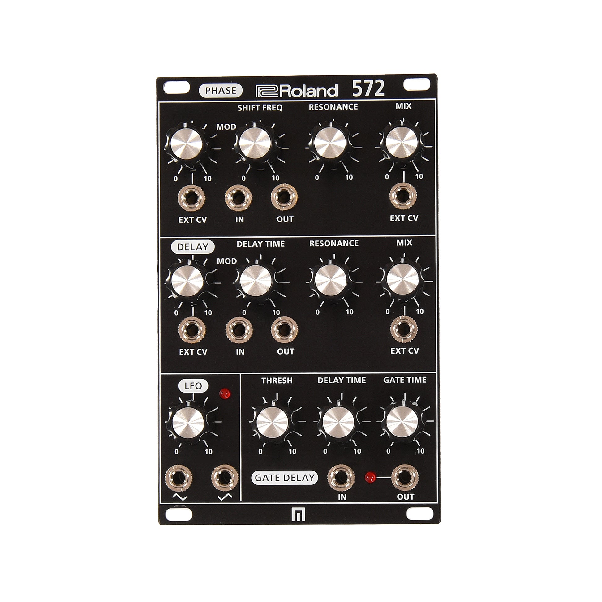 The 572 Phase Shifter, Delay and LFO is a time-based, multi-effects module. The 572 includes a five-stage phase shifter, analog audio delay, a control voltage gate delay, and an LFO. The phase shifter has panel controls for shift frequency and resonance amount that can vary from subtle to a deep, lush analog effect. Similarly, the audio delay has independent knob control of delay time and resonance (or feedback) for short chorus-like modulation delays. Both the phase shifter and delay can be modulated by the 572’s internal LFO or external CV signals and feature wet/dry effects mix controllable via the front panel or with CV.