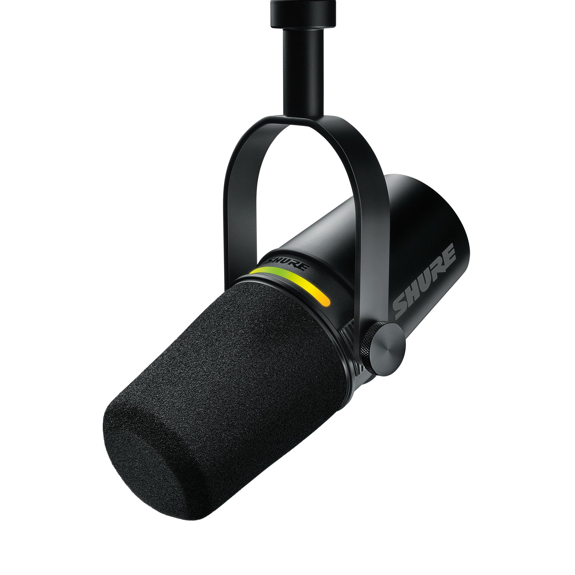 The Shure MV7+ is the updated version of a dynamic microphone designed to capture high-quality audio for podcasting, streaming and music making via hybrid USB-C and XLR outputs. It has a customizable LED touch panel that can display millions of color combinations while acting as a live audio level meter. When using the USB-C output with the MOTIV MixTM desktop app or MOTIV mobile apps, the MV7+ can access DSP features such as a Digital Popper StopperTM, real-time Denoiser and 3 types of reverb, as well as gain, EQ, compression and more. The microphone has a durable diecast aluminum design with an adjustable yoke.
