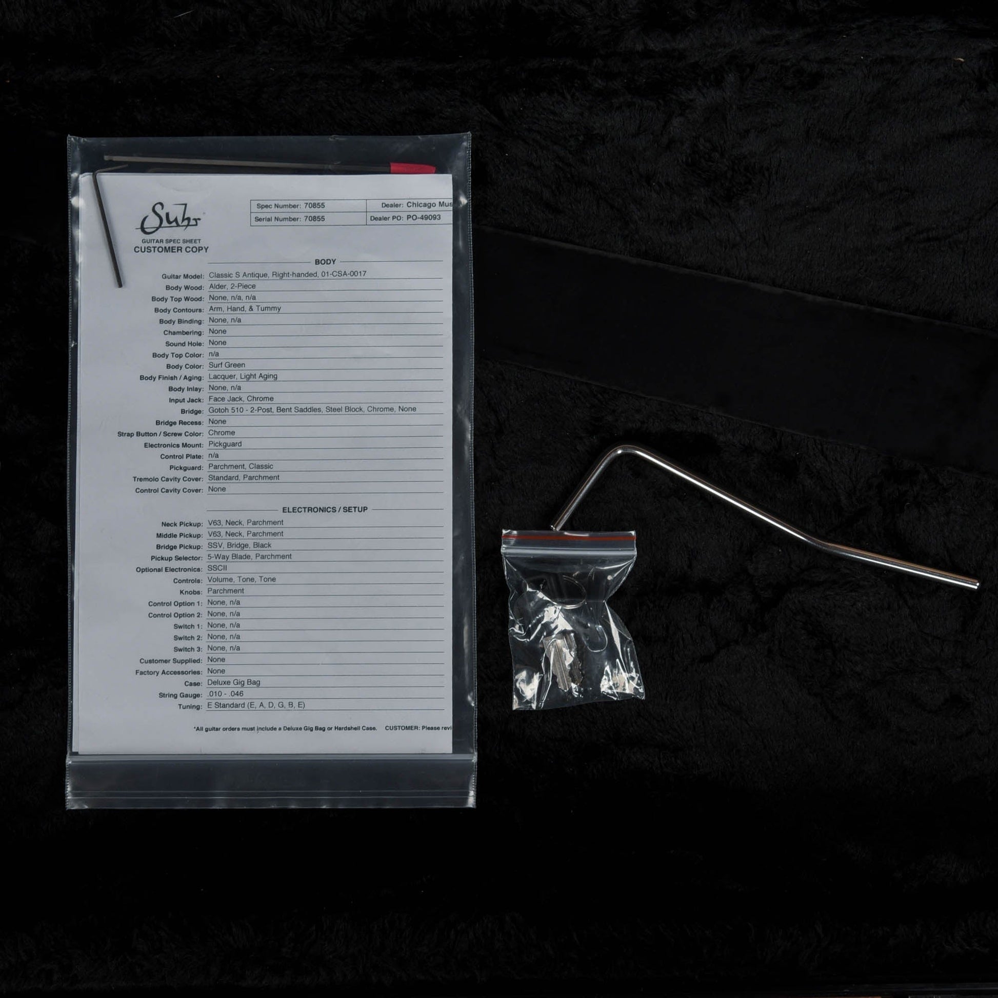 | Tech Notes: | This Classic S plays well with low action and optimal neck relief. The frets are tall and show light play wear. It has been properly setup and intonated in standard tuning. |
