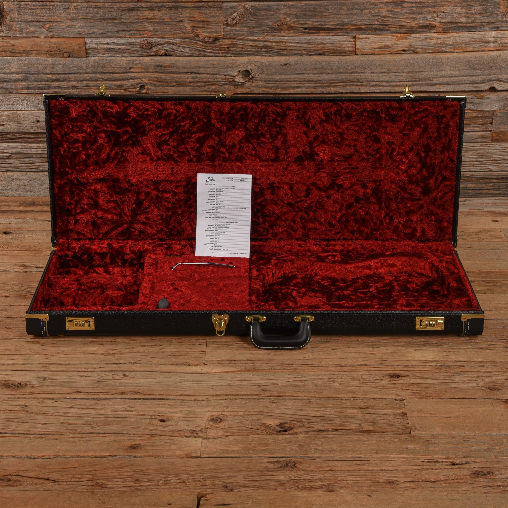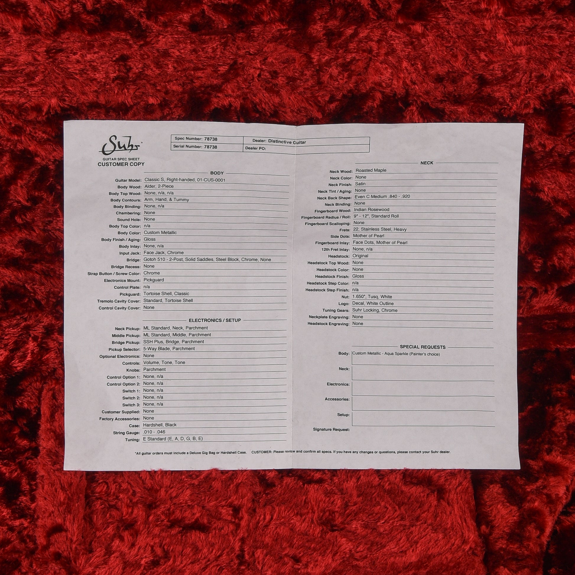 | Tech Notes: | This Suhr plays well with low action. The frets are tall and show light wear. |