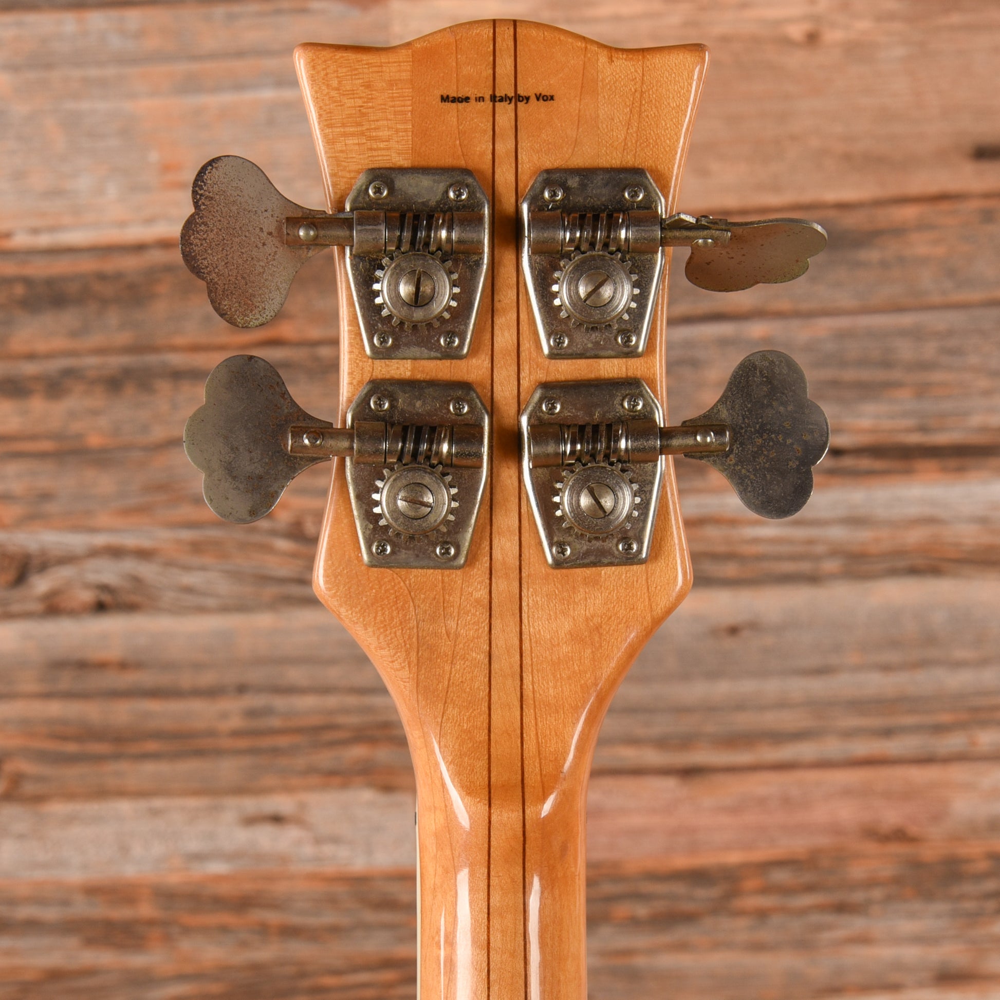 Cosmetic Condition: This vintage Vox bass is in good condition. The finish is glossy with long checks running down the body and neck. The top shows a small dent near the controls on the edge of the body. The metal hardware is lightly tarnished with age.