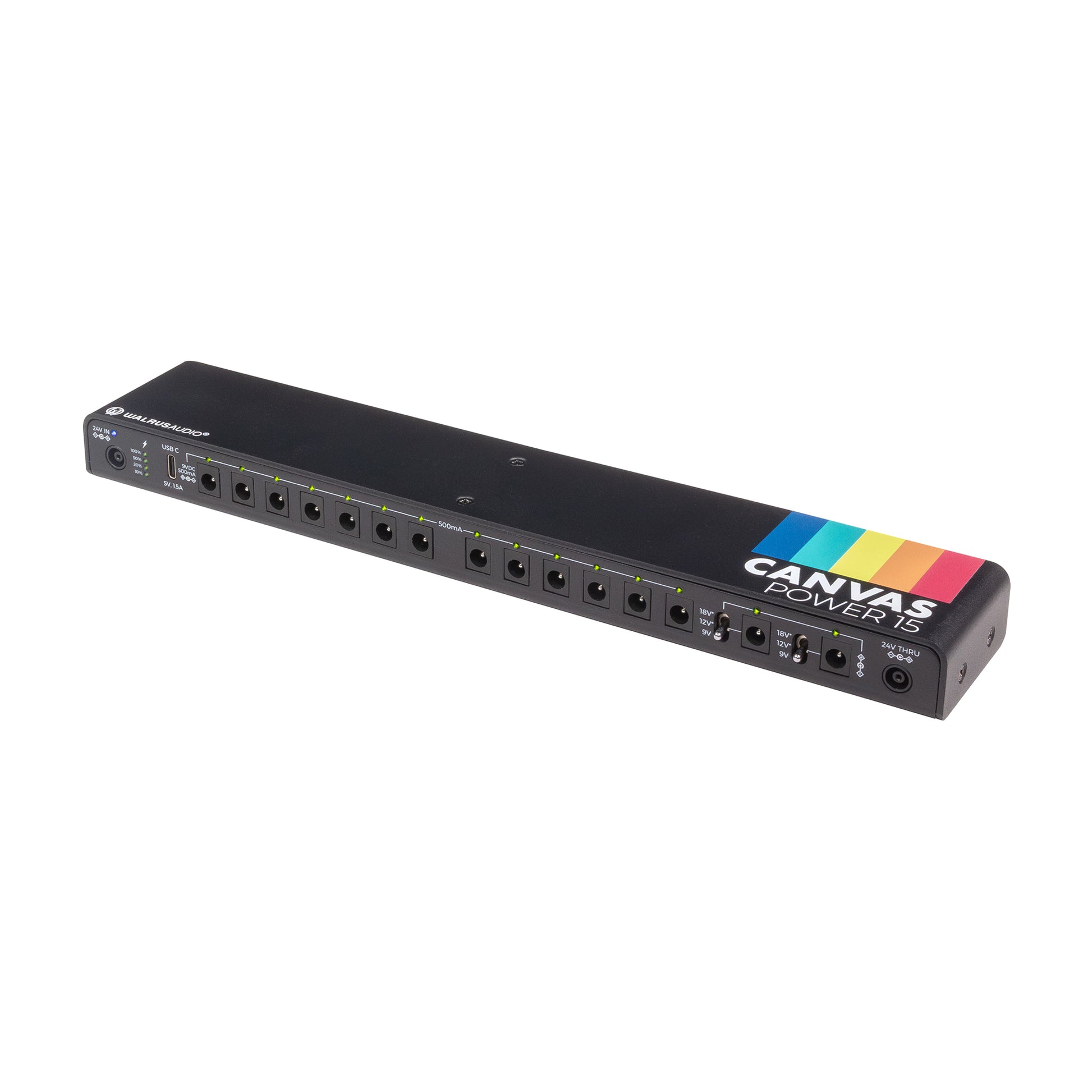 • The Canvas Power 15 has 15 isolated power outputs delivering up to 500mA of clean power at 9v. Two of the outlets are variable voltage, letting you switch between 9v, 12v, and 18v for powering high-voltage pedals. It also includes a USB-C port for powering devices like your phone or tablet while you play.